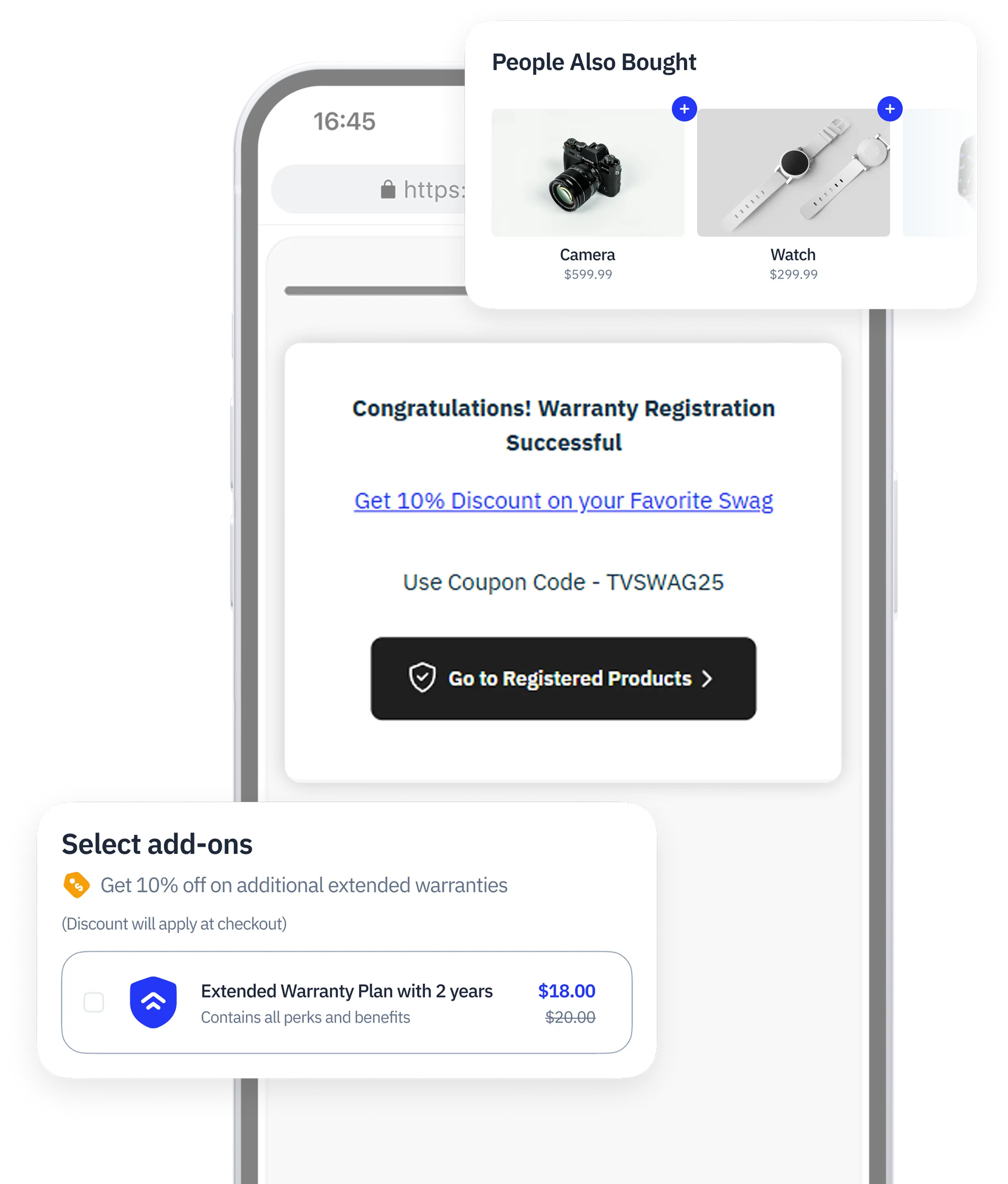 Offer extended warranties, protection plans, and add-ons during registration, checkout, and post-purchase moments.